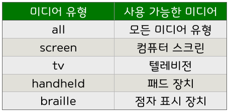 위의 구문에서 'screen'부분은 미디어 유형을 정의하는 것입니다. 어떤 유형의 미디어에 대해서 스타일을 적용하게 될지를 정하는 것인데요. 미디어 유형에 들어갈 수 있는 것은 다음과 같습니다.