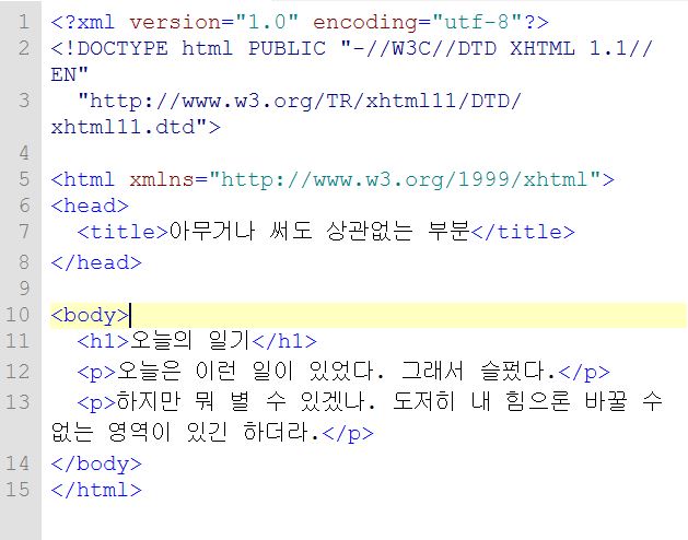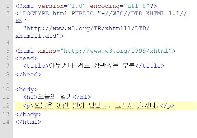 그 다음 <h1>오늘의 일기</h1> 라는 내용이 11번째 줄에 추가가 되었습니다. 이 <h1></h1>사이에 들어가는 내용은 페이지에 큰 글씨로 제목을 표시하고 싶을 때 넣어주는 내용입니다.