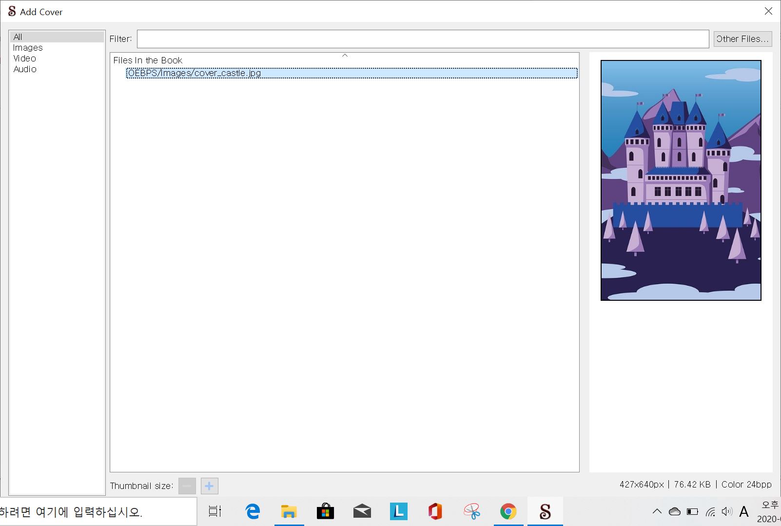 Add Cover 창이 뜹니다. 여기에서 표지로 추가하고 싶은 이미지(방금 추가한 이미지)를 더블 클릭해줍니다. 그러면 자동적으로 이 창은 닫힙니다.