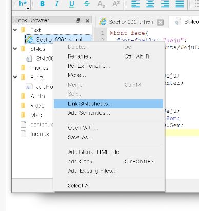 본문파일을 마우스 오른쪽 버튼으로 클릭한 다음, Link Stylesheets 를 선택해주세요.