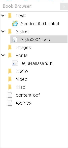 일단 Styles 폴더 안에 새로운 스타일시트를 하나 만들어 줍니다. 그리고 Fonts 폴더에는 전자책의 글꼴로 사용할 '제주한라산' 글꼴을 추가해주었습니다. 참고로 제주한라산 글꼴은 무료글꼴이라서, 포털사이트 검색창에 검색만 하셔도 쉽게 구하실 수 있습니다.