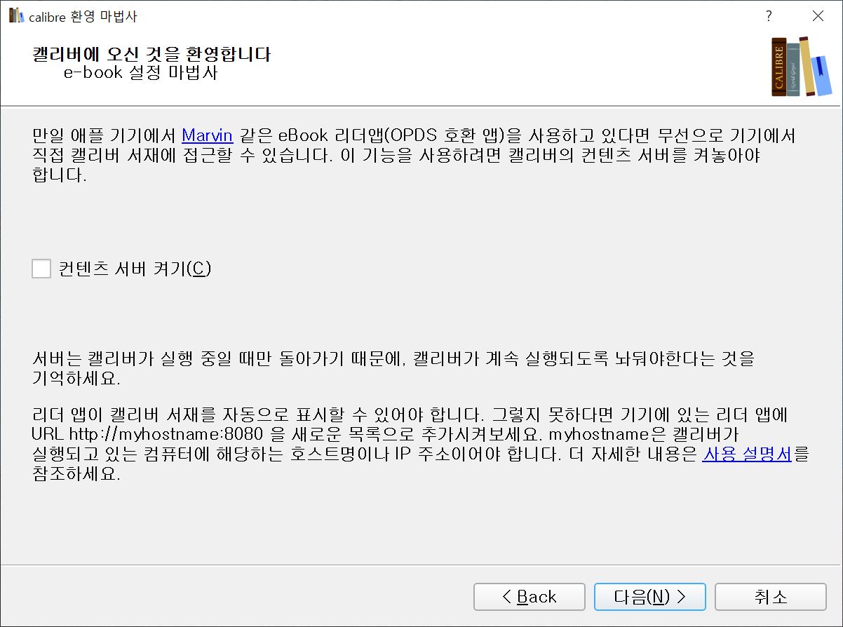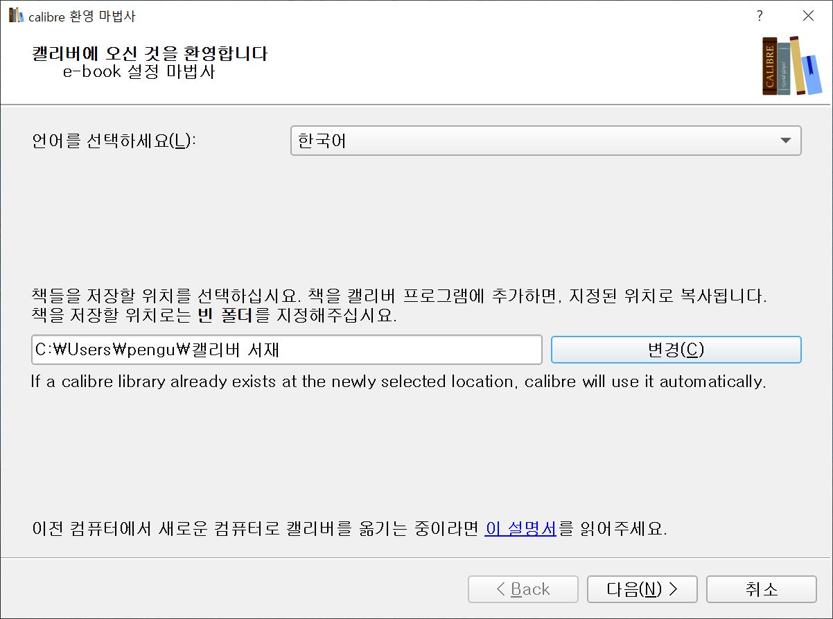 칼리버(calibre)를 설치 후 최초 실행하게 되면 위와 같은 창이 나옵니다. 언어 선택과 전자책 저장 폴더 지정을 요구하는 창입니다. 일단 언어는 한국어로 해주시면 되겠죠? 그리고 책 저장 폴더는 편한대로 원하는 위치로 지정하시면 되겠습니다. 되셨으면 다음.