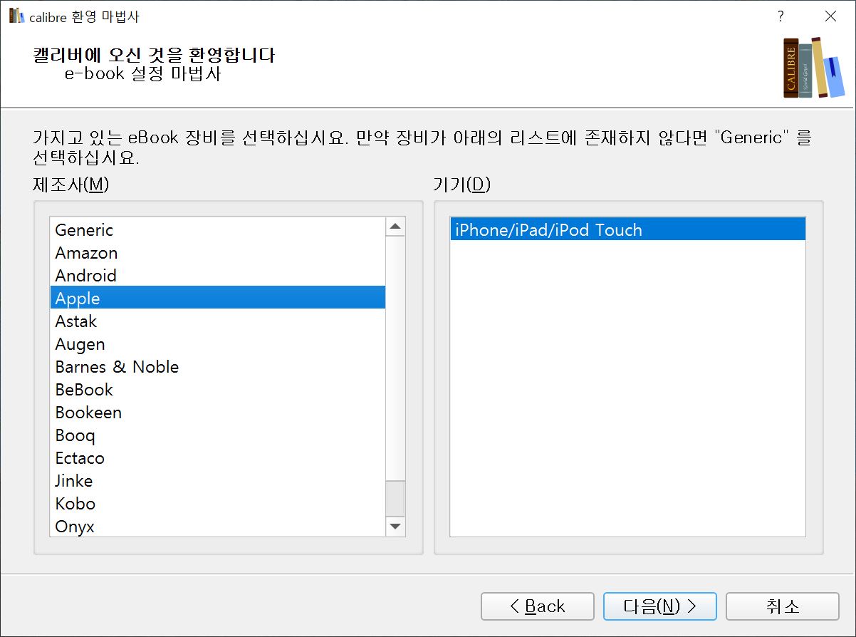 그런 다음 기기를 선택해줍니다. 여기서 기기라 함은 칼리버로 전자책을 볼 때 어떤 기기의 형태로 보고 싶은지를 말하는 것입니다. 저는 애플의 아이폰, 아이패드 등을 사용하는 게 편하기 때문에 위와 같이 선택하였습니다.