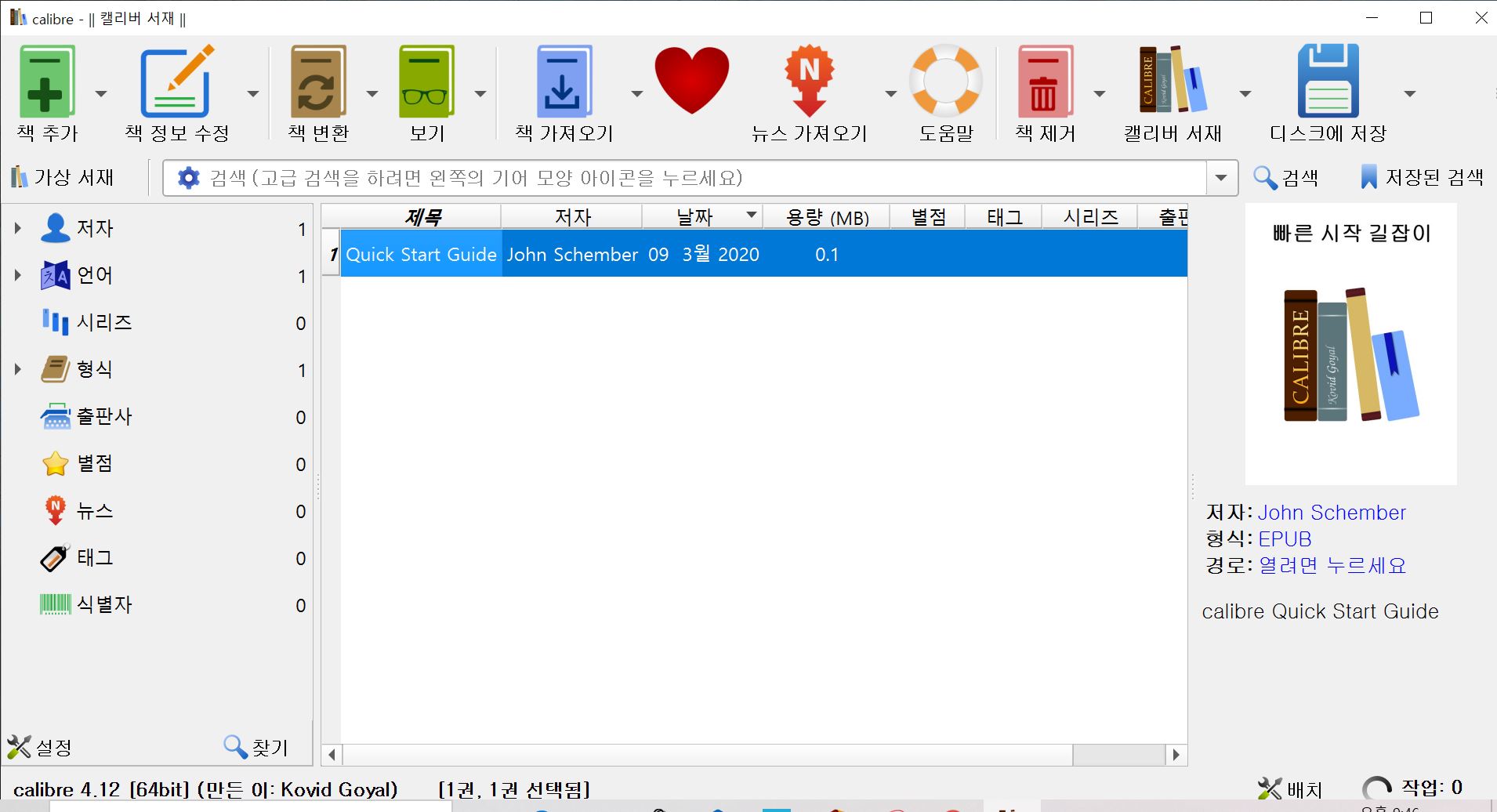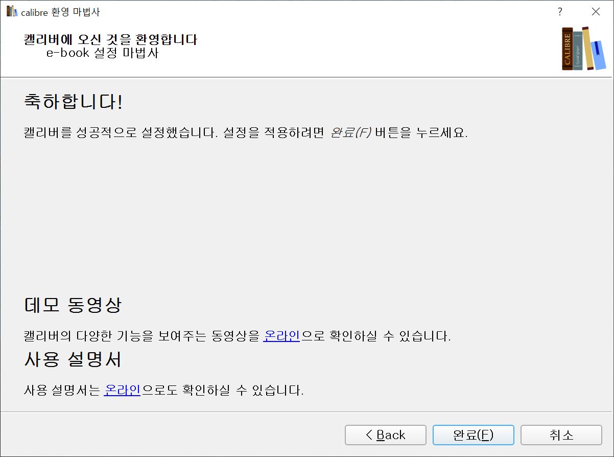 여기까지 해서, 전자책 전용 뷰어인 캘리버(calibre)의 설치 및 실행 과정을 모두 확인해보았습니다. 전자책을 만들다가 전자책의 형태가 어떤지 중간 점검을 하고자 할 때, 이 소프트웨어를 유용하게 사용하실 수 있을 것입니다. 이 한 페이지만으로 캘리버의 모든 것을 파악할 수는 없겠지만, 설치가 잘 되었으니 사용법 등은 시간을 두고 이것저것 만져보시면서 파악해 보시길 바랍니다.