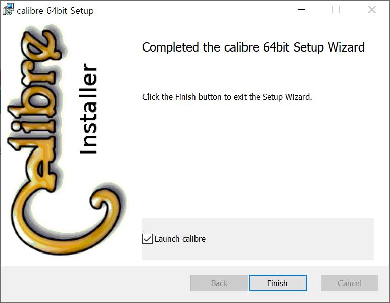 Launch calibre에 체크해주시고 Finish를 눌러주세요.