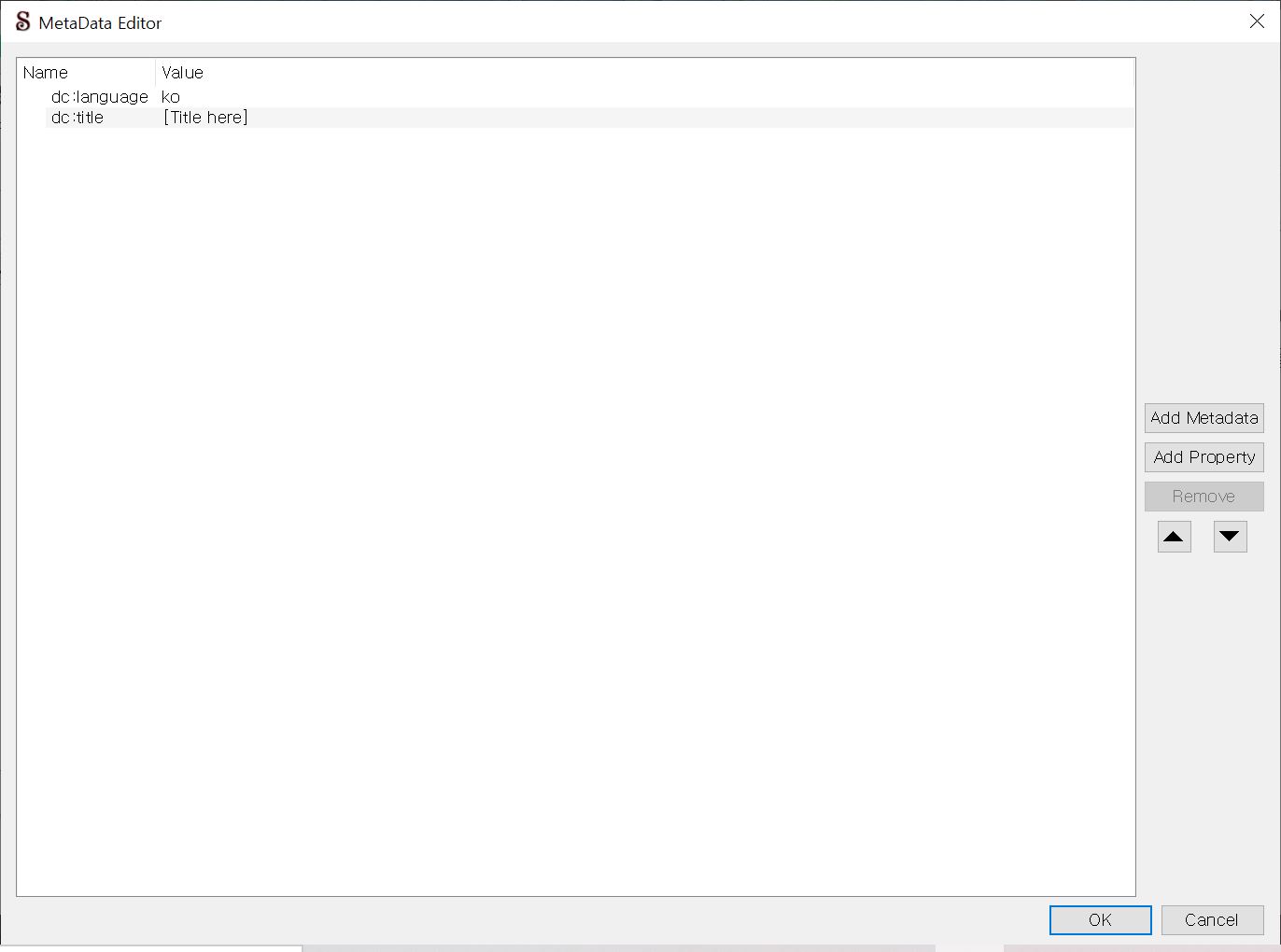 위의 창에는 언어(language)와 제목(title) 데이터가 미리 만들어져 있는 상태입니다. 그러니 창 오른쪽에 있는 'Add Metadata'를 눌러 저자와 출판사 항목을 추가한 다음, 각각의 내용을 기입해보도록 하겠습니다.
