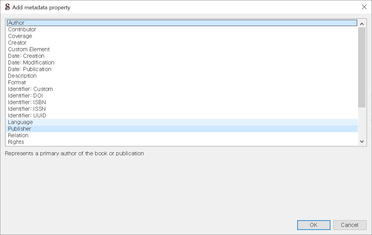 Add Metadata 창입니다. 아주 많은 항목이 존재하지만, 우리에게 필요한 최소한만 선택해보겠습니다. 저자(Author)와 출판사(Publisher)를 선택하신 다음 OK를 눌러주세요.