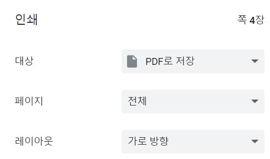 인쇄 화면이 등장했습니다. 여기에는 여러가지 선택 항목이 있습니다. 이중에서 '대상' 항목을 'PDF로 저장'으로 바꾼 다음 이하 항목들을 입맛에 맞게 바꾸어주고 저장만 하면 끝입니다. 무척 간단하죠? 그러면 항목 수정을 한번 해보겠습니다.