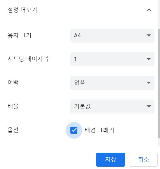 이 배경그래픽의 경우 웹사이트에 적용되어 있는 그래픽 효과들까지도 pdf에 저장할 것인지 여부를 선택하는 것으로, 이것을 선택하지 않을 경우 이미지나 그래픽(색상이나 글자 배치 등)이 누락될 가능성이 있습니다. 이 점 참고하여 주세요.