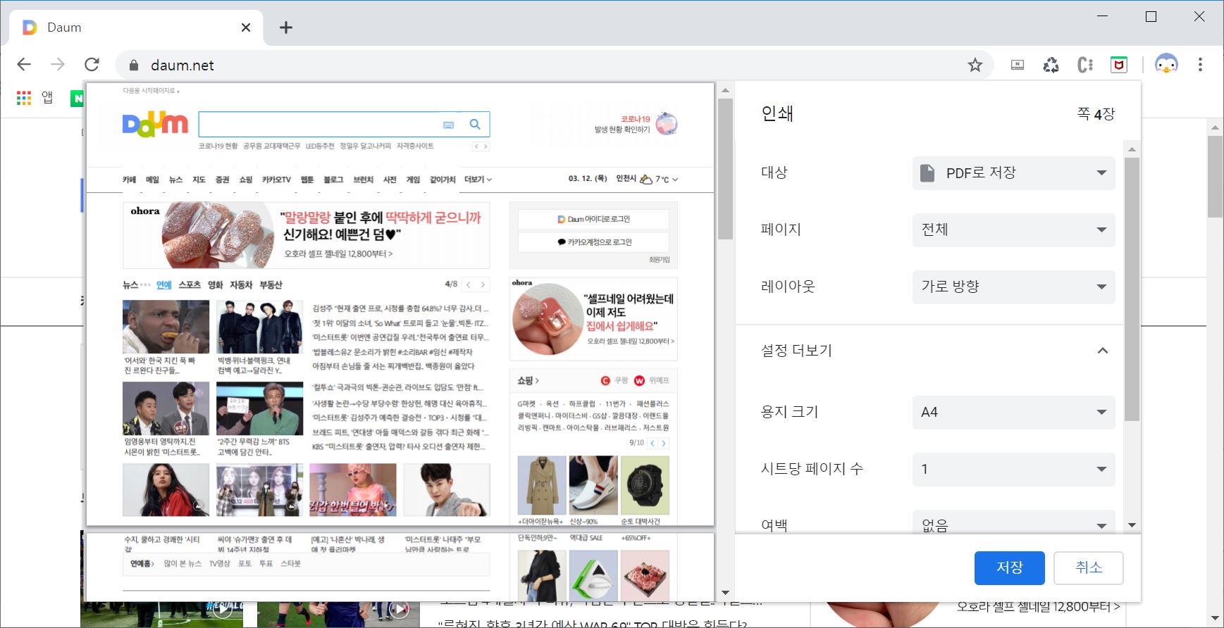 크롬으로 다음(Daum) 홈페이지를 열고, 홈페이지 화면을 pdf로 저장하는 과정입니다.