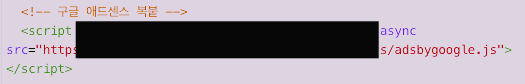 시작을 했더니 '애드센스에 사이트 연결'이라고 해서 애드센스 코드가 제공됩니다. 이 코드를 그대로 복사하여 티스토리 블로그에 붙여넣으면 됩니다. 붙여넣는 방법은 아래와 같습니다.