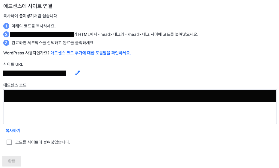 제공된 애드센스 코드를 블로그에 붙여넣기 하셨으니, 이제 '코드를 사이트에 붙여넣었습니다'에 체크하시고 '완료'를 눌러주세요.