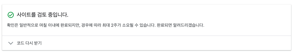 그러면 구글에서 자체적으로 코드 검색 후 문제가 없다면 사이트 검토를 시작합니다. 안내가 나오죠? 며칠 이내에 완료되지만, 최대 2주까지 걸릴 수 있다네요. 참고로 저는 딱 하루 걸렸습니다.