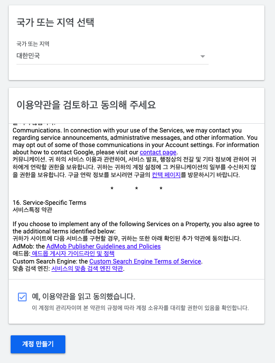 다음은 국가 선택입니다. 저는 대한민국에서 하고 있어요. 국가 선택 후, 이용약관에 동의하고 계정만들기를 선택합니다.