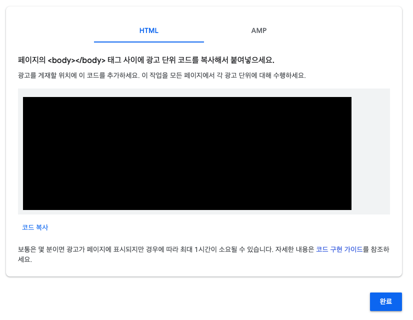 광고가 만들어지면 코드가 생성됩니다. 이 코드를 티스토리 블로그 글에 삽입하면 삽입된 자리에 광고가 표시되는 것입니다.