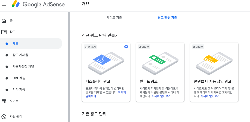 애드센스 카테고리 중 광고 카테고리가 있습니다. 여기에서 개요 부분으로 이동하면 됩니다. 개요에서는 광고 단위를 기준으로 신규 광고 단위 만들기가 가능합니다. 여기에서 디스플레이 광고 부문을 선택하시면 됩니다. 나머지 두 개에 대한 자세한 내용은 저도 잘 모르겠네요.