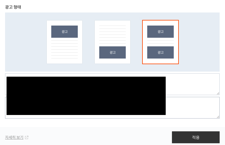 플러그인을 클릭하면, 위와 같은 화면이 등장합니다. 광고 형태 세 가지 중 가장 우측에 있는 형태를 클릭하신 다음, 아래에 있는 빈칸에 복사한 코드를 붙여넣기 해주세요. 거기까지 되셨다면 적용을 누르시면 됩니다.
