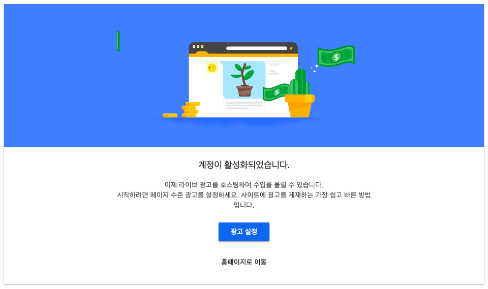 애드센스 홈으로 이동이 됨과 동시에, 계정이 활성화되었다는 페이지가 나옵니다. 광고 설정으로 가서 내 블로그에 게재할 광고를 세팅해보도록 하겠습니다.