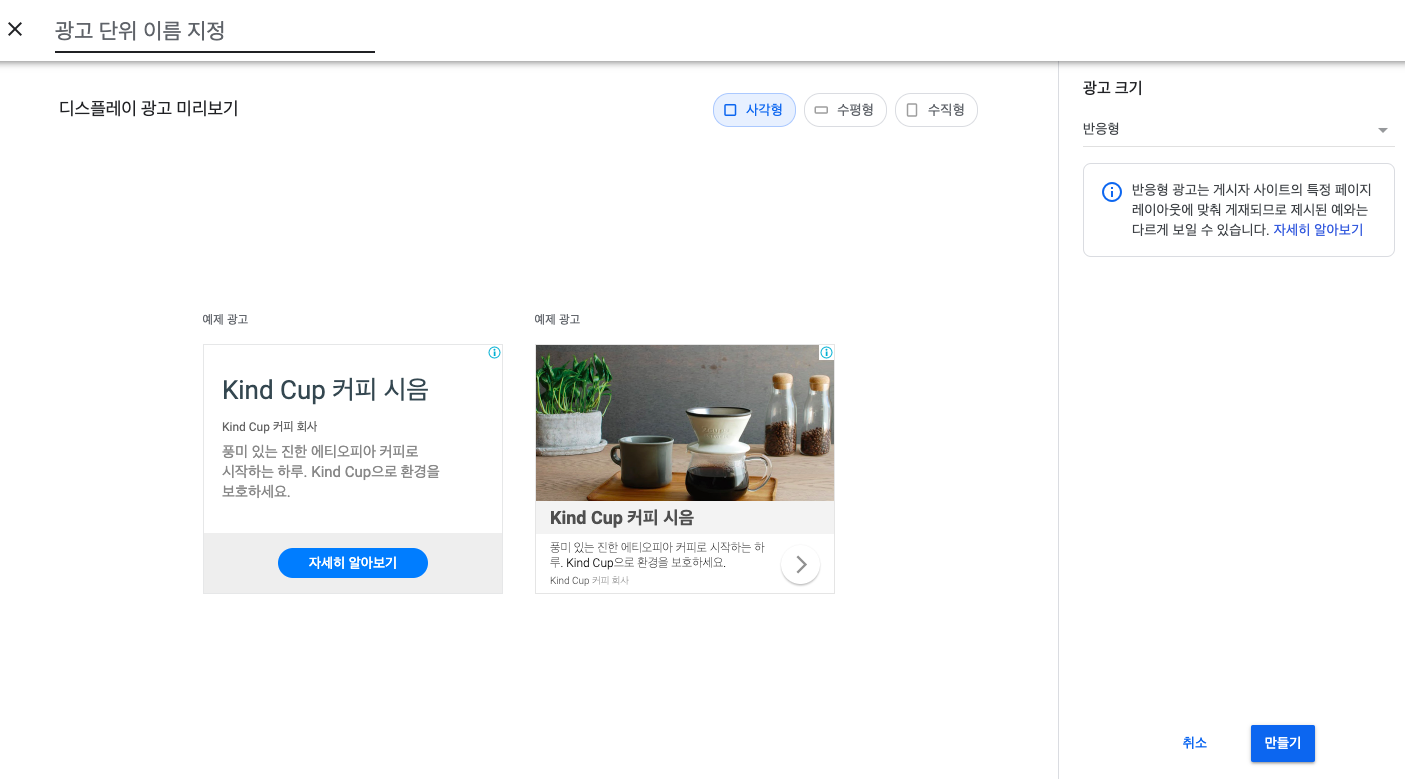 디스플레이 광고를 클릭하면, 광고 단위를 생성할 수 있는 화면이 나타납니다. 해야할 일은 단 하나, 광고 단위 이름 지정을 하는 것입니다. 좌측 상단에 입력 칸이 보이시죠? 화면 가운데에는 광고 샘플이 표시되고 있습니다.