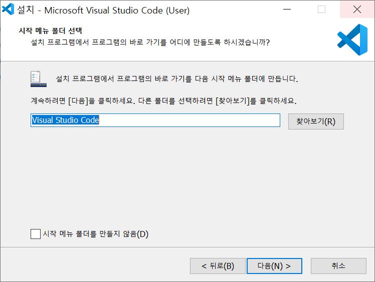 다음은 시작 메뉴 폴더 선택 화면입니다. 말 그대로 시작 메뉴에 VSCODE가 나타나도록 하는 것입니다. 이 또한 특별한 이유가 있지 않은 이상, 기본 설정을 그대로 유지한 채 넘어가시면 되겠습니다.