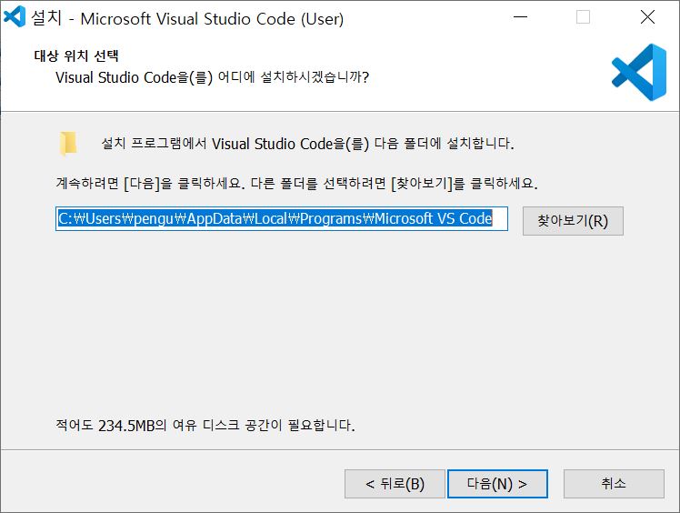 이번 화면은 설치된 VSCODE가 위치할 폴더를 지정하는 화면입니다. 특별히 원하는 위치가 있는 경우가 아니라면, 기본으로 정해져있는 위치를 그대로 둔 채 다음으로 넘어가시면 됩니다(기본 위치 사용을 권장합니다).