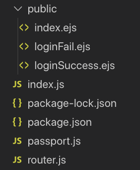 뷰는 ejs를 사용했고, 로그인 화면과 로그인 성공/실패시 화면을 각각 만들었습니다. 그리고 동작 구현에 필요한 최소한의 기능만을 자바스크립트로 구현해봤는데, 비밀번호 암호화라던지 보안 관련 내용은 전혀 포함하지 않았습니다. 그저 정해져있는 아이디와 비밀번호가 통과가 되는지 되지 않는지만을 구현했고, passport의 사용법만을 간단히 구현해 본 것입니다.