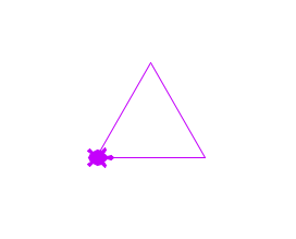 forward() 함수는 거북이가 이동할 거리를 인자로 받아 그만큼을 이동시켜주는 함수입니다. 여기서는 100px만큼 이동했습니다. 거북이가 처음 실행됐을 때 거북이의 방향은 왼쪽을 바라보고 있으므로, 삼각형을 그리기 위해서는 왼쪽으로 120도 꺾도록 left() 함수에 120을 전달해줍니다. for문을 통해 해당 동작을 3회 반복하면 결과적으로 삼각형이 그려지게 됩니다.