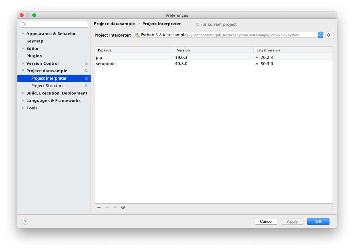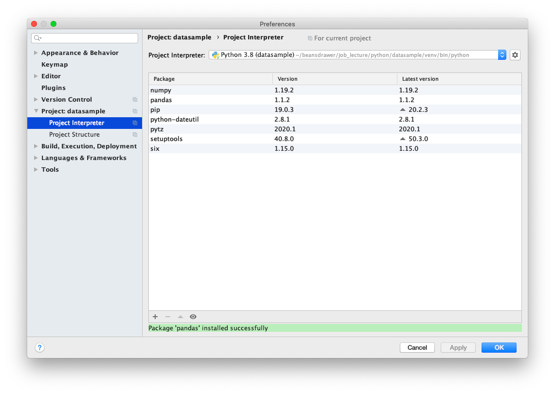 프로젝트 인터프리터 설정으로 들어가서 판다스 설치부터 진행하겠습니다. 위 이미지는 설치 전의 모습입니다(OS X, Pycham CE).