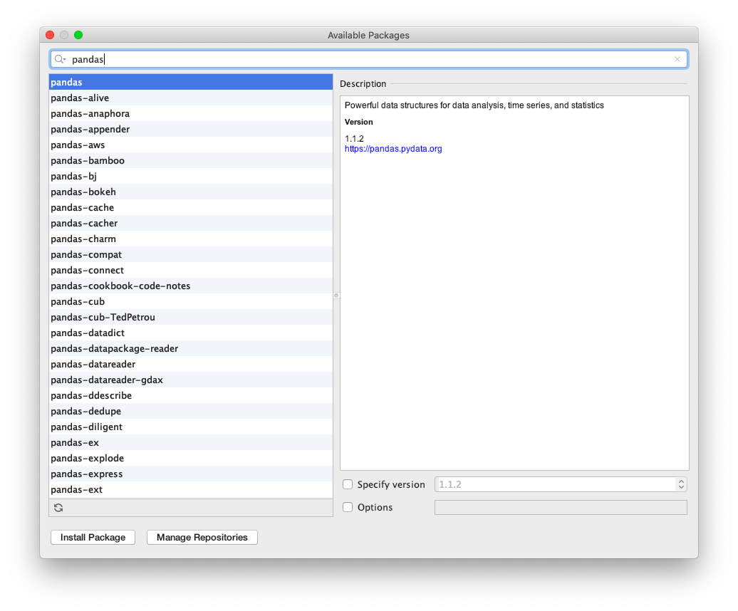 pandas 패키지를 검색하고 install package를 진행합니다.