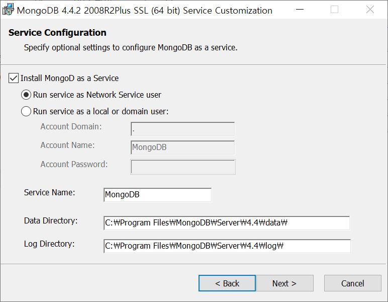 어떤 유형의 몽고디비 설치를 원하는지 선택하라고 나옵니다. Custom은 특별히 원하는 설정이 있는 경우 선택하는 것이므로, 그런 경우가 아니라면 Complete 하시면 됩니다.