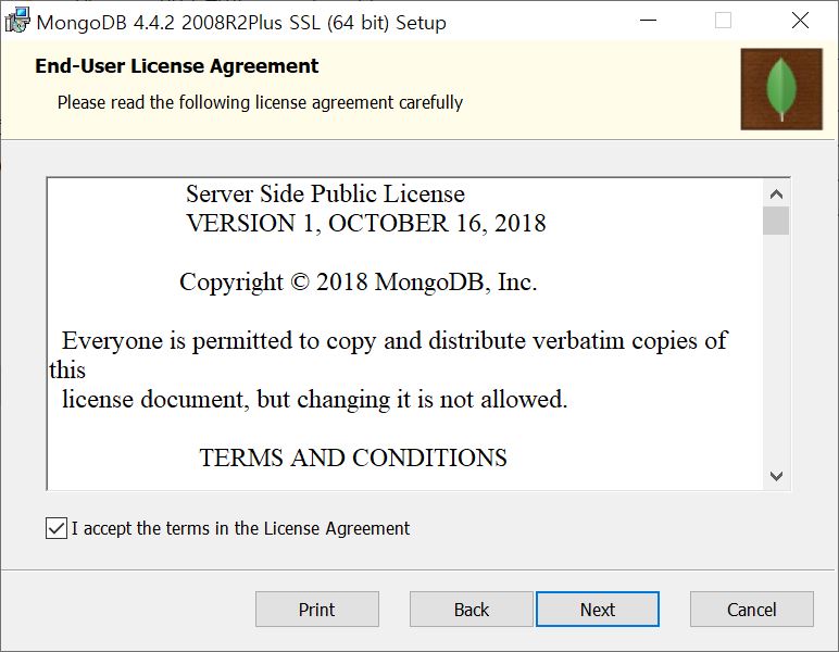 콤파스 설치 여부에 대한 제안입니다. 콤파스는 몽고디비 사용을 위한 그래픽UI 입니다. text 기반의 명령어로 프로그램을 실행하는 것이 익숙치 않은 분들에겐 무척 도움이 되는 소프트웨어입니다. 설치 항목에 체크하고 Next 합니다.