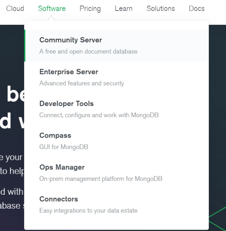 몽고디비 설치 및 사용을 위해 메뉴 항목 중에 Software에 속해있는 세부 항목 Community Server를 선택해주겠습니다.