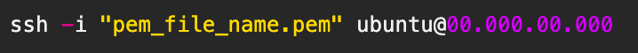 마지막으로 서버 인스턴스에 대한 원격 제어를 위해 SSH 프로토콜을 통한 접속 명령어를 입력해줍니다. 정확인 pem 파일 이름을 기입해주고, 운영체제 또는 인스턴스명(이 경우 우분투 리눅스)과 정확한 ip주소를 입력해주면 됩니다.