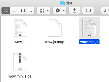첫 번째는 dist 폴더 내에 있는 wow.min.js 파일입니다. 라이브러리의 핵심 기능이 작성되어 있는 자바스크립트 파일로, wow.js를 사용해도 되지만 min 버전의 용량이 더 가볍고 기능은 동일하기에 min 버전을 추천합니다.