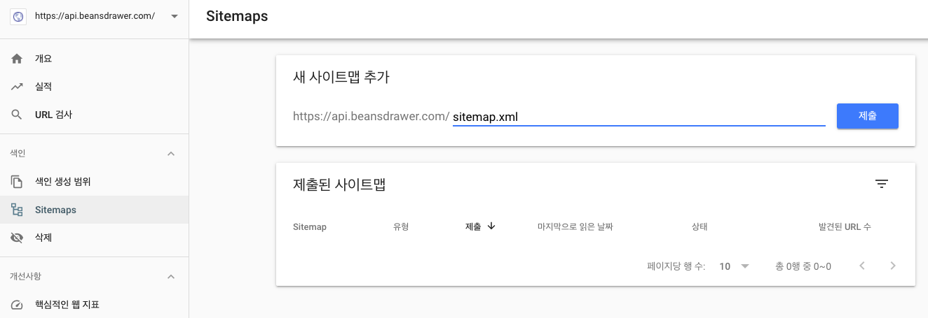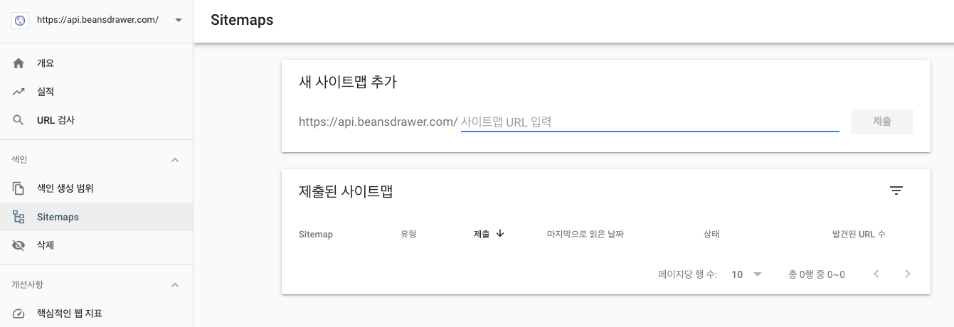소유권 확인 완료 후 속성이 추가되면, 좌측 메뉴 중 sitemaps 를 선택합니다. 여기에서는 홈페이지의 사이트맵을 추가해주는 작업이 진행됩니다. 사이트맵은 사이트에 있는 페이지, 동영상 및 기타 파일과 그 관계에 관한 정보를 제공하는 파일입니다. 때문에 페이지에 사이트맵이 등록되어 있으면 검색에 좀 더 유리합니다.