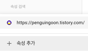 구글 로그인이 되어 있는 상태에서 구글 서치 콘솔(search.google.com/search-console/)에 접속합니다. 그러면 좌측 상단에 '속성 검색'이라는 폼이 보이는데, 이를 누르고 '속성 추가' 버튼을 눌러 속성 추가를 진행합니다. 여기에서 속성이란 내 홈페이지에 대한 분석 항목을 의미합니다.
