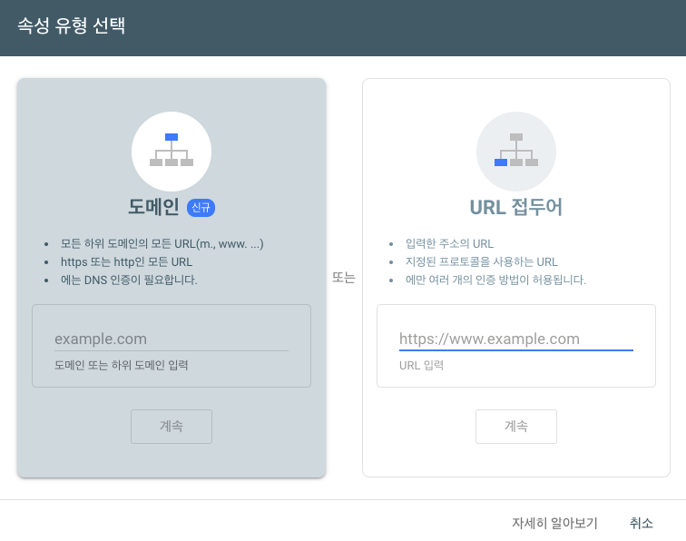 그러면 속성 유형 선택 이라는 창이 뜨는데, 여기에서 블로그나 개인 웹사이트에 대한 등록을 하려면 우측 'URL 접두어'를 선택하신 다음 여기에 사이트의 URL을 입력해주시면 됩니다. http... 로 시작하는 URL을 틀림없이(!) 입력해주세요.