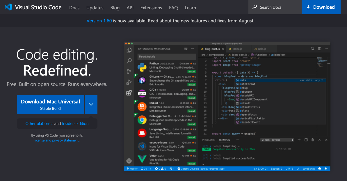 Live Sass Compiler는 코드 에디터 Visual Studio Code(이하 VSCode)의 확장 기능으로, Sass 또는 SCSS 구문으로 작성된 코드를 실시간으로 모니터링하여 즉각적으로 CSS 파일로 빌드해주는 기능입니다. 이를 사용하기 위해서는 먼저 VScode를 설치해야 합니다. VSCode 홈페이지에 접속하여 메인 페이지에 있는 파란색 버튼을 누르면 VScode의 설치가 시작됩니다. 설치 과정은 무척 간단하므로 자세한 설명은 생략합니다.