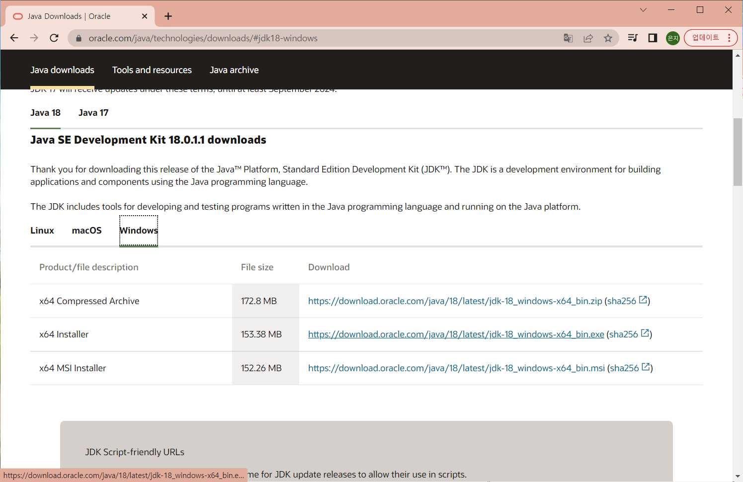2. 오늘(2022.06.24) 최신 버전은 18.0.1.1 이네요. 사용 중인 운영체제를 선택하고, 설치 파일을 선택합니다.