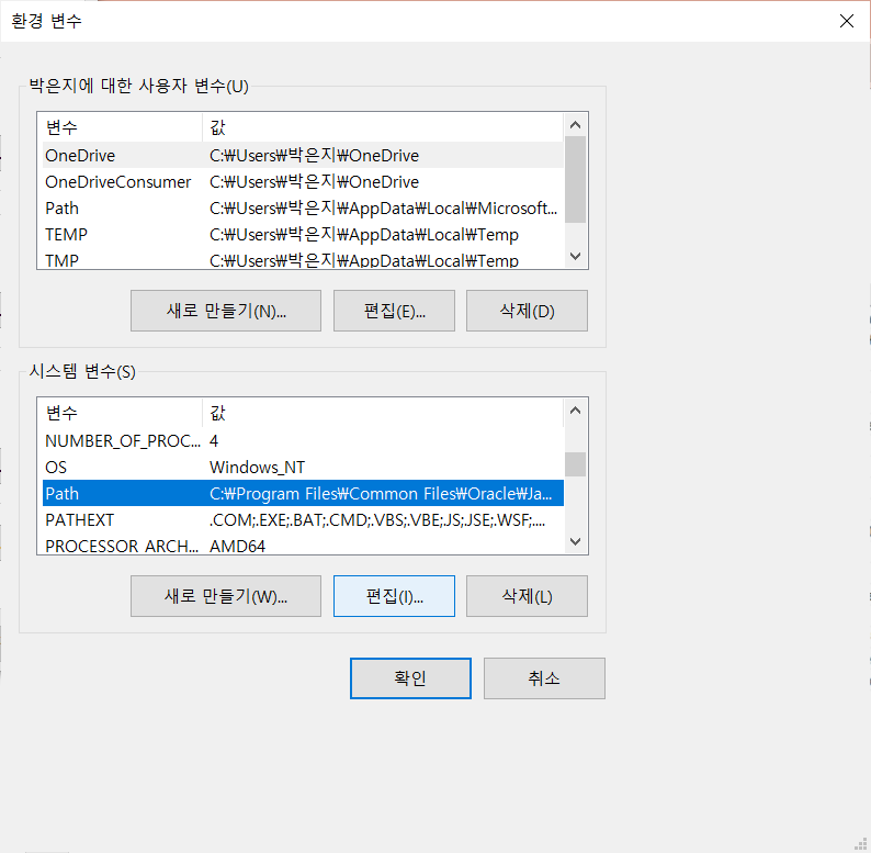 8. 다음으로 기존 시스템 변수에 내용을 추가하는 작업을 하겠습니다. Path 라는 시스템 변수를 클릭한 다음, '편집' 버튼을 클릭합니다.