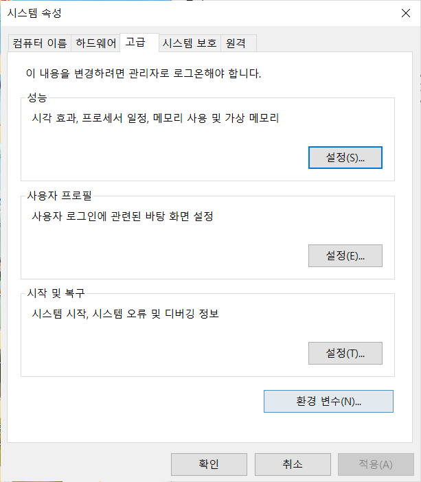 5. jdk 설치를 마쳤으니 환경변수 설정을 바로 진행하겠습니다. 윈도우 설정 메뉴를 열고, '고급 시스템 설정' 항목을 선택하면 '시스템 속성'이라는 이름의 창이 뜹니다. 여기에서 '환경 변수' 메뉴를 선택합니다.
