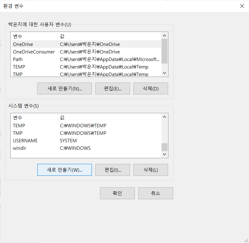 6. 환경 변수 창이 뜨면, 시스템 변수 항목 바로 아래에 있는 '새로 만들기' 버튼을 클릭합니다. jdk 사용을 위한 환경 변수를 추가할 것입니다.