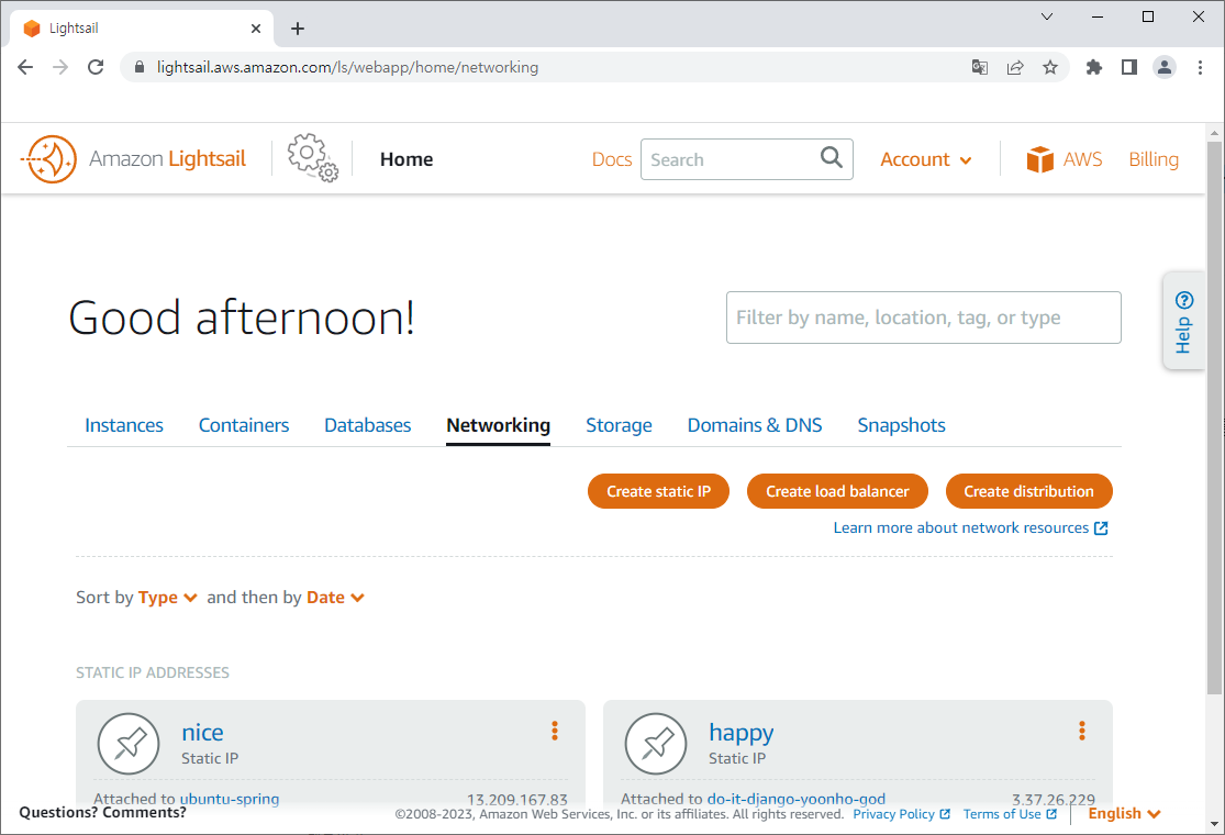 1. AWS lightsail 인스턴스에 접근할 수 있는 고정 IP를 생성하겠습니다. IP란 인터넷 상에서 내 서버의 주소를 나타내는 값이라고 보시면 됩니다. AWS lightsail 네트워크 화면(https://lightsail.aws.amazon.com/ls/webapp/home/networking)에서 [Create static IP]를 클릭합니다.
