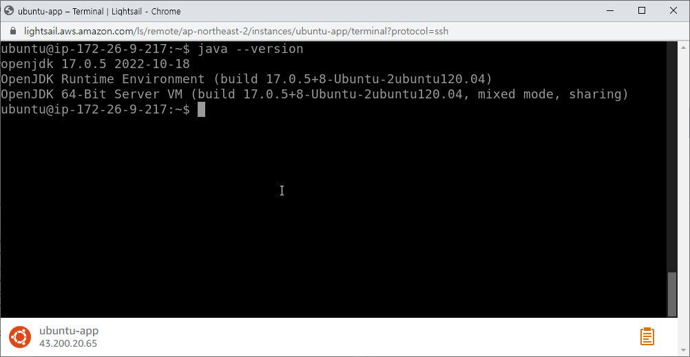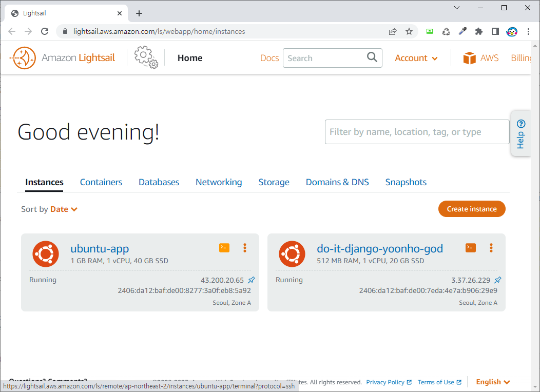 1. AWS lightsail 홈 화면에 있는 인스턴스 중 스프링부트 프로젝트를 배포할 가상 서버의 터미널을 엽니다. 인스턴스에 표시되고 있는 터미널 모양 아이콘을 클릭하면 됩니다.