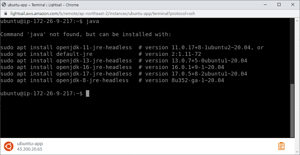 마지막 세 번째 명령어는 설치된 자바의 버전을 확인하는 것으로, 설치가 잘 되었다면 아래와 같은 결과를 확인할 수 있습니다.